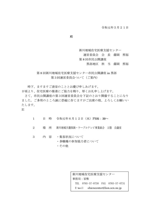 6月12日「第8回市民公開講座 in 黒部」第3回運営委員会のご案内(PDF)