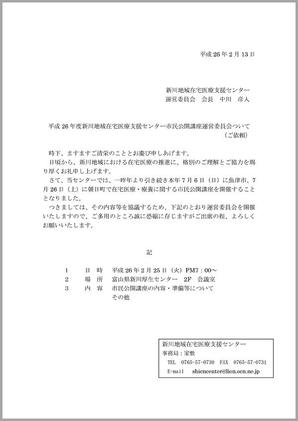 TOP : 平成26年度新川地域在宅医療支援センター市民公開講座運営委員会ついて(案内文)