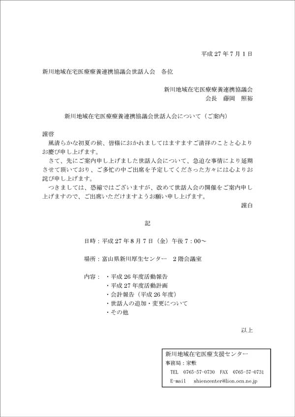 : 8月7日「新川地域在宅医療療養連携協議会 世話人会」のご案内