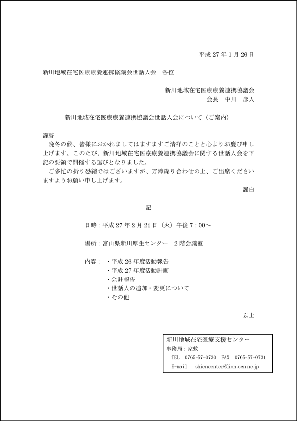 平成26年度新川地域在宅医療支援センター運営委員会・作業部会 案内文(PDF)