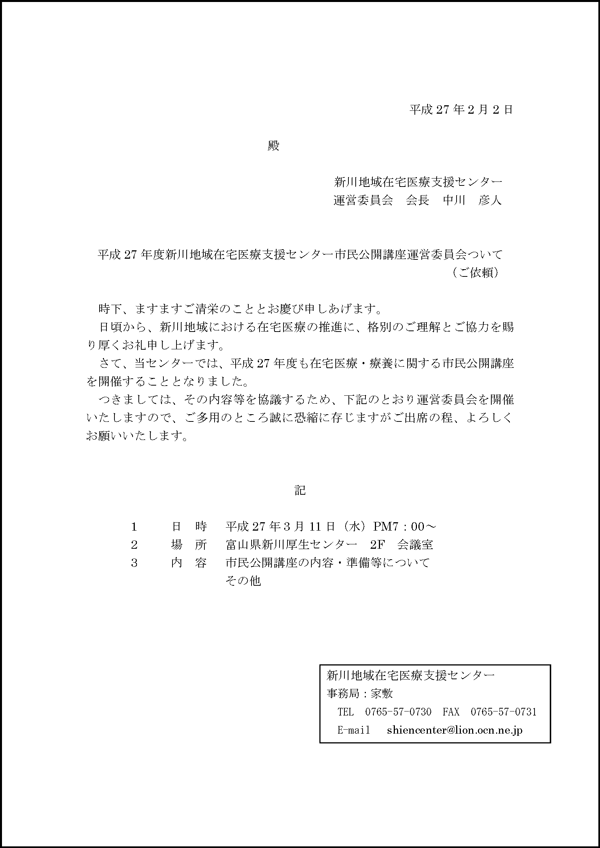 平成27年度新川地域在宅医療支援センター市民公開講座運営委員会 案内文(PDF)